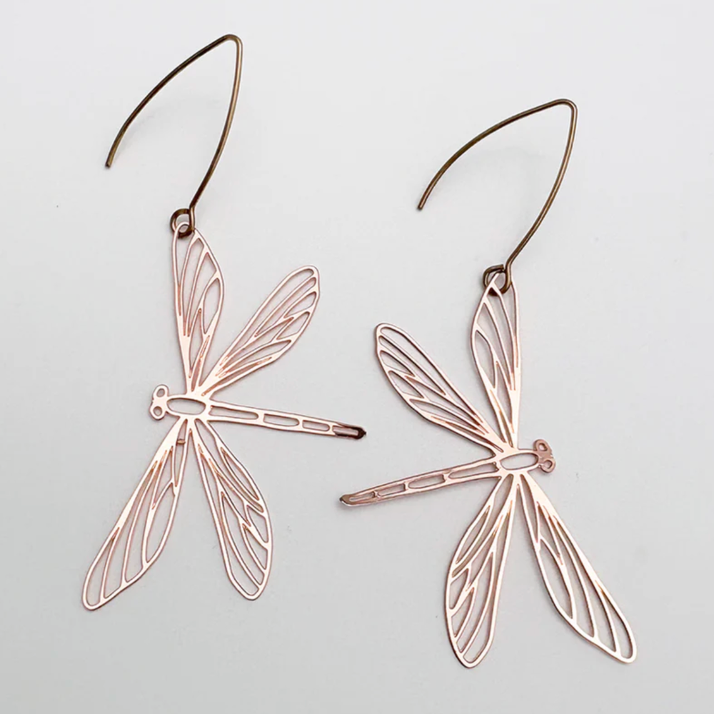 Denz & Co super lightweight rose gold coloured dragonfly earrings made from recycled stainless steel. Hypoallergenic and ideal for all day wear.